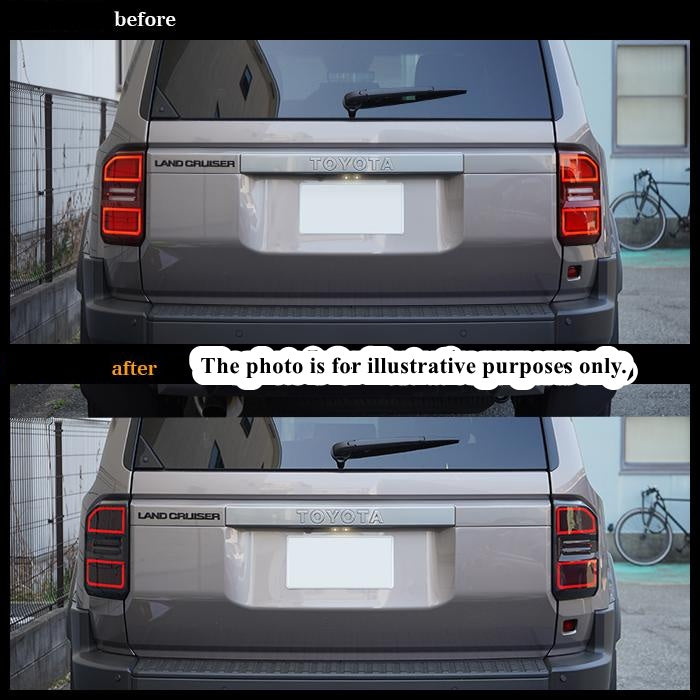 These smoked tail light covers are designed to fit the Toyota Land Cruiser 250 Series, adding both protection and a stylish dark-tinted appearance to the rear lamps.